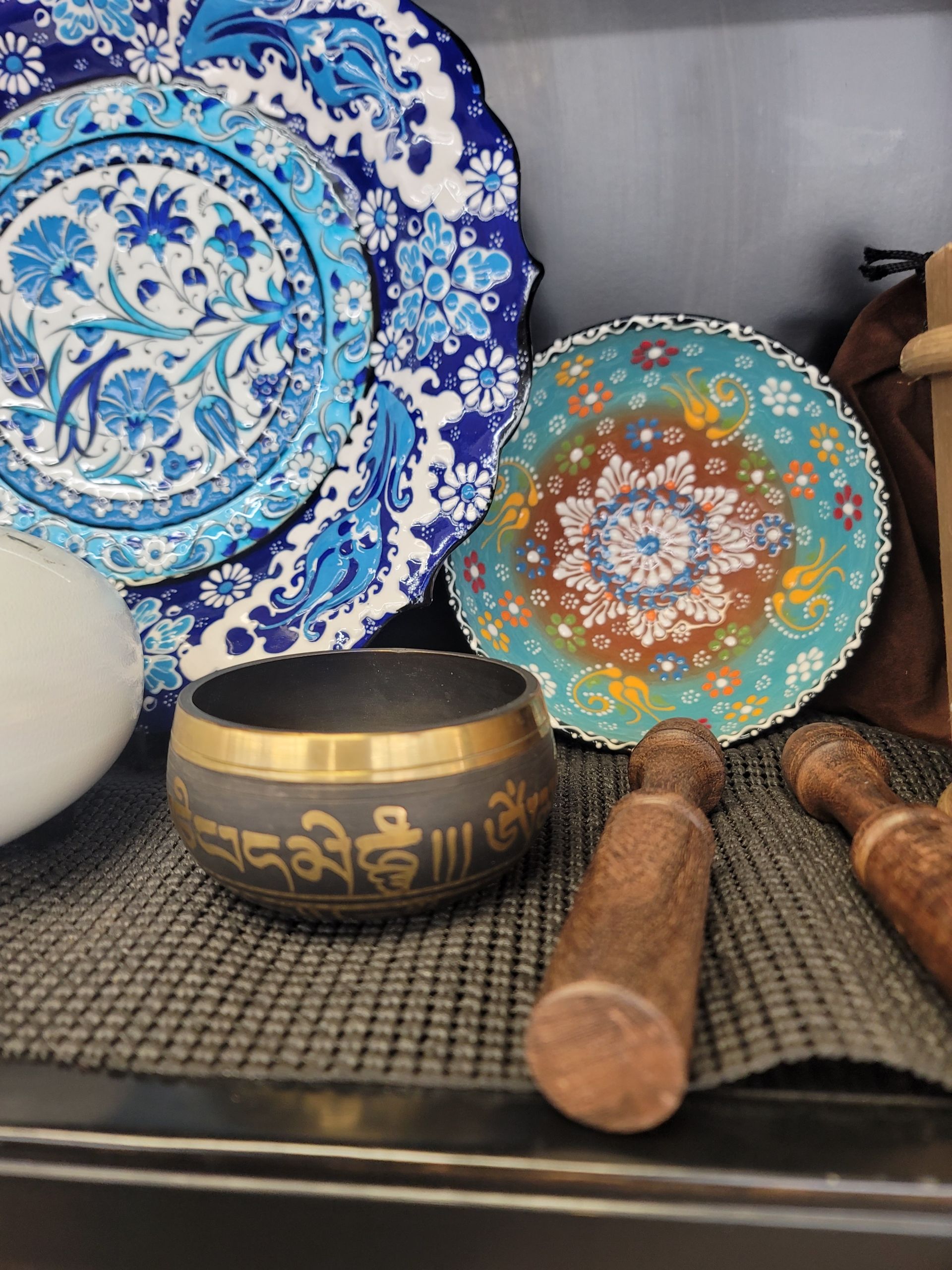 Singing bowls, also known as Tibetan singing bowls, are ancient metal vessels originating from Himalayan spiritual traditions, crafted to produce resonant tones and vibrations when struck or rimmed with a mallet. These harmonic sounds create a meditative atmosphere, often used in sound healing sessions, yoga practices, or mindfulness rituals to signal the start or end of meditation or to deepen focus. They are particularly valued for their therapeutic benefits, including inducing deep relaxation by engaging the brain's theta waves, reducing stress and anxiety levels, alleviating feelings of tension and depression, and promoting overall spiritual wellness and emotional healing.